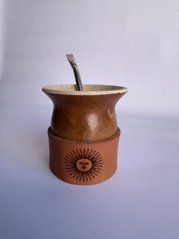Mate de calabaza pulida, con base de cuero vaqueta cocida y grabada, diseño Sol de Mayo
